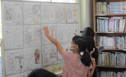 2学期に入って,久しぶりの図書館でした。「何を読もう」「長めの本とすぐ読める本」などのつぶやきが聞こえてきました。図書館には5・6年の図書委員会のみなさんのおすすめの本もあり,「どこにあるんやろう」と宝探しをするかのようでした。