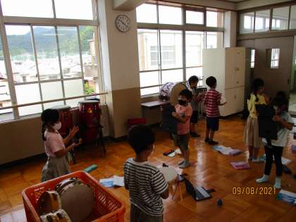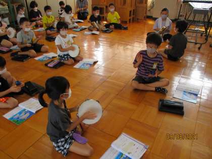 2拍子や3拍子を感じ取りながら,リズム打ちをしています。