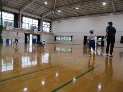 打ったり受けたりする練習をした後,ゲーム開始!(人数が少ないので先生もチームに入ります。)