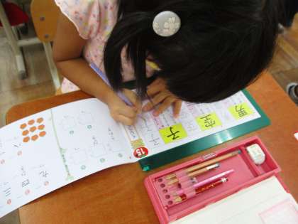 カタカナの学習も終わり,いよいよ漢字の学習が始まりました。子どもたちは「この漢字知ってる!」「自分の名前についている字や!」と話しながら,学習を進めています。宿題でも,毎日半ページずつ,漢字の学習が始まってます。