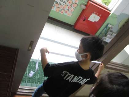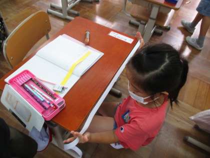 算数科おおきさくらべの学習では,教室にある机が扉から出せるかどうかを紙テープを使って調べました。さらに,教室の中にある他のものも扉から出せるかどうかを調べました。とても楽しそうに学習に取り組んでいました。