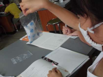 自然の中の水の謎を追って,実験を進めています。本日は「水蒸気」です。水蒸気を見つけるために,イチゴパックの容器やラップ,ジッパー付ナイロン袋に保冷剤を入れるなどしています。時間が経つと水滴が現れます。いったいこの水滴の正体は何なのでしょうか。