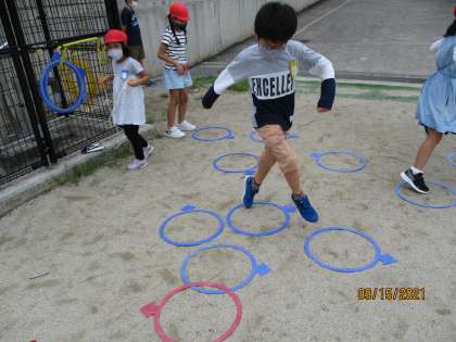 リズムよくとんだり,遠くにとんだり,言われた色にとんだり,いろいろな遊びをしています。