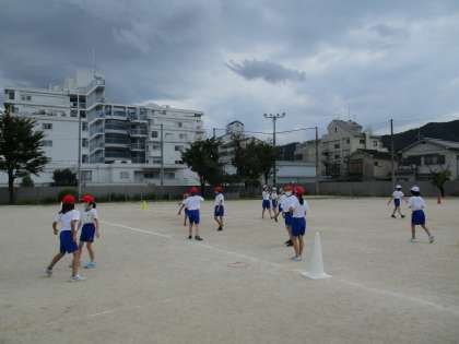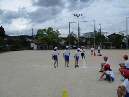 バトンパスをしながらのリレーは久しぶりです。なかなかパスが上手くいかず,手こずる子どもたち。でも,少しの間練習をすると上達する様子も見られました。