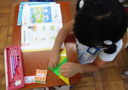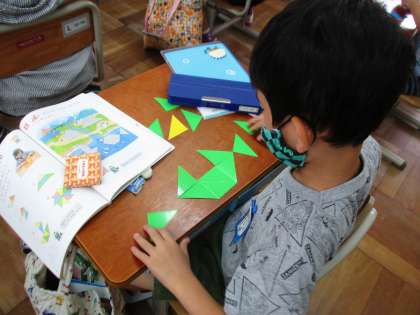 かたちづくりの学習では,△の色板を使って,前に出された形を自分でも作りました。今日はさらにレベルアップして,影絵を見て,それに合うように形を作りました。魚や,ヨットなど難しい形もたくさんありましたが,子どもたちは「絵のほうに,線を引いたら簡単にわかるよ!」「周りの線を見ながらやったら簡単にできる!」と言いながら完成させていました。