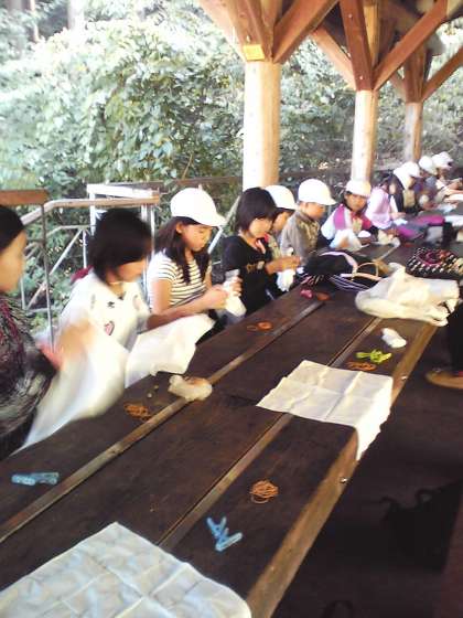 今日の午前中は「草木染め」に挑戦しています。たまねぎの皮を使って染めます。
