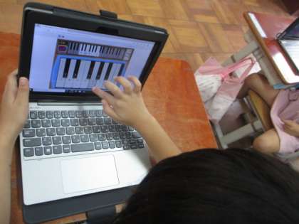 29日(水),音楽の学習で,タブレットを使って鍵盤ハーモニカの練習をしました。タブレットに出てくる鍵盤の部分を指で押すと,いろいろな音がなる仕組みです。