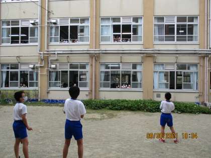 6年生の応援団の人が,応援練習をしています。2年生は,それを見よう見まねで練習をしています。