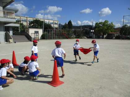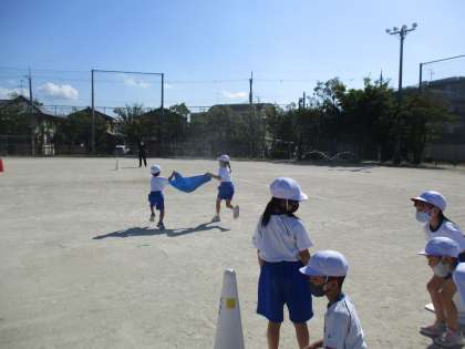今日も運動会練習を行いました。今日は,ころころたまごの様子を…。赤帽子は1組,白帽子が2組です。