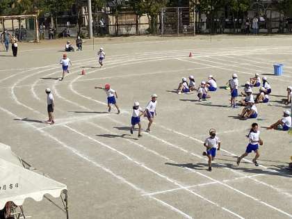 午後の部が始まりました。午後は高学年の部です。写真は5年生の団体競技「リレー」の様子です。力強い走り方や工夫したバトンの受け渡しなど白熱した戦いが繰り広げられていました。さすが高学年です。