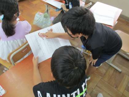 今日の学習では友だちが書いた生き物の隠れ方カードを見合いました。子どもたちは「枝になりきる生き物がいるんだってすごい!」「季節によって体の色が変わるんだって!」と感想を言い合いながら見ていました。