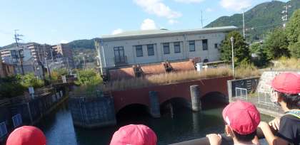 「ここが入口?」「何かスゴイところに来たなぁ」と目の前のものに釘付けになります。中には「ほんまにここなん?」と疑う子もいました。目前には県境にある山が見えています。小関越えがこれから始まります。