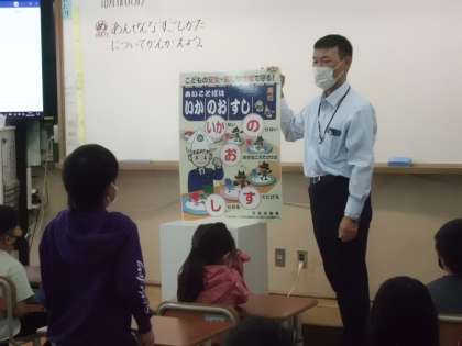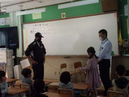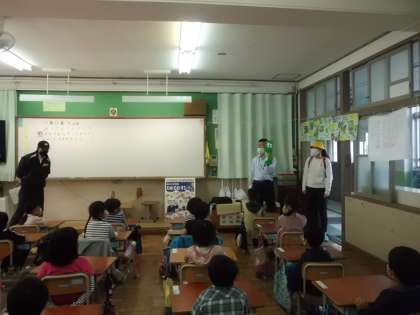 右京警察署の方に来ていただき,防犯教室を行いました。「いか・の・お・す・し」を教えてもらい,実際に右京警察署の方の実演を見ました。「あんなふうに言って逃げたらいいんだとわかりました。」「今日の帰り道からさっそく,後ろを見ながら帰るようにしたいと思います。」と子どもたちは今日の学習を振り返っていました。