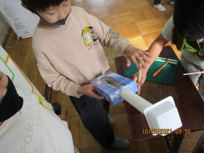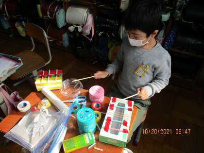 「わりばしでこすった時とたたいた時で,音が変わるね。」