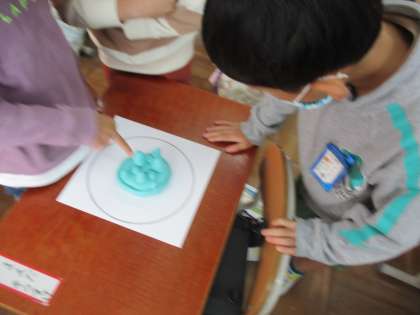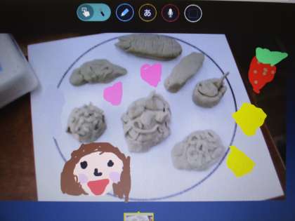 2組では,図工の学習で,ねんどを使って自分の食べたいごちそうを作りました。ごちそうを作った後には友だちの作品を見合ったり,ロイロノートのカメラ機能を使って写真を撮り,絵を描き加えたりしました。どの子もとっても美味しそうなごちそうができあがりました。