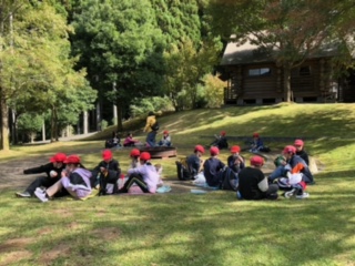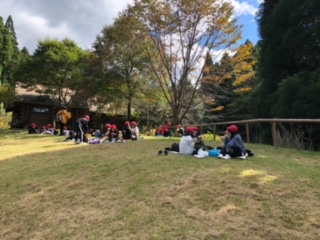 午前の活動が終わりました。楽しい昼食の時間です。手作りおにぎりをほおばっています。