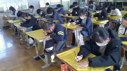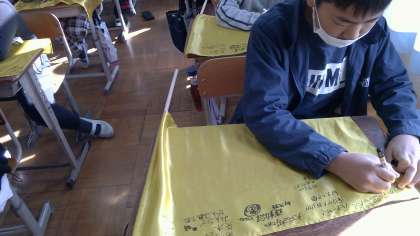 22日(金)運動会が終わって,2週間が過ぎました。今日は,集団演技で使った旗に,みんなの一言メッセージを書きました。運動会で頑張ったことを思い出しながら,一人一人に気持ちを込めて,書いていました。