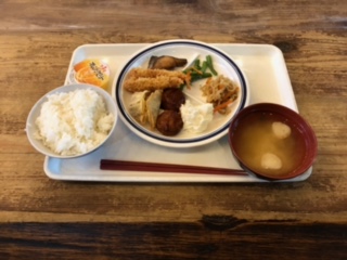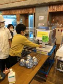 いよいよ夕食が始まりました。感染対策もされています。ごはんのおかわりは,マシーンで入れます。この後の活動に向けて,少し早めの夕食です。