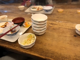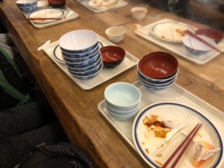 夕食が終わりました。これまでと違って,取り分けられたおかずを選ぶようになっているので,たくさん食べた人は,食器がたくさん積みあがることに・・・。たくさん食べて,元気に過ごしています。