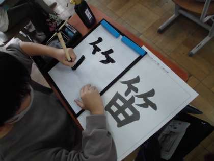 書写の内容もますます難しくなってきました。左右の字形で「林」を学習したあとは「笛」という字で上下の字の形に注目します。字形もですが,止め・はね・はらいについても練習は続きます。