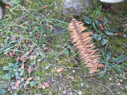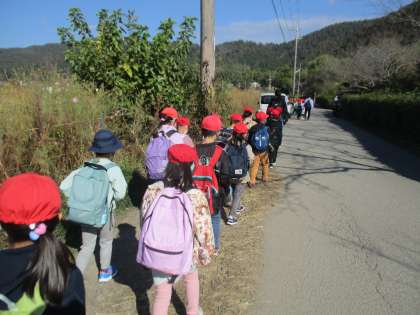 9時半ごろに学校を出発し,兒神社を抜け,北に向かって歩きました。途中の休憩場所には,学校では見られない変わった形の葉っぱや柿,どんぐりなどが見られました。子どもたちは,「魚の骨みたい!」「こんな松ぼっくり初めて見たわ!」と言いながら,持ってきていたビニール袋に一生懸命詰め込んでいました。