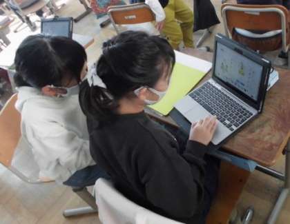 GIGA端末を使って,パフェ作りをしてしました。活動では店員役の友だちに外国語で何が欲しいかを伝えないといけません。しかし,思いおもいのパフェができたときには,「これはおいしそう」「こんなに積んだらこぼれる」と思わず,日本語で話してしまいます。