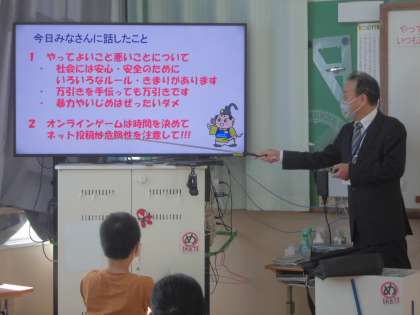 学校にルールがあるように,世の中にもルールがあることを伝えていだたきました。中でも「人に迷惑がかかることはしない」という話をしていただきました。しかし「しない」ということを伝えに来られたのではなく,本当に伝えたいことは「いけないことをいけないと言える人になってほしい」「いけないことをしている人を止められる大人になってほしい」とのお話でした。