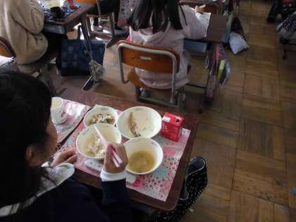 2日(木),今日は給食で「焼き開き干さんま」が出ました。年に1回しか出ない給食だそうで,パワーポイントの説明を聞きながら,味わって食べていました。