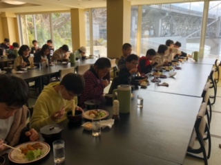 修学旅行でみんなで食べる最後の食事となりました。2日間の出来事を思い出しながら食べています。