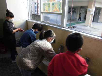 ある石鹸を使ってしっかり手を洗うと,色が変わってくるそうです。たくさんの子が時間をしっかりかけて手を洗っていました。