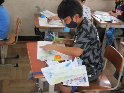 先週絵の具でいろいろな模様をつくりましたが,今日は,その模様を好きな形に切って,組み合わせて1つの作品を仕上げました。動物にしたり海の世界にしたりしながら楽しんで表現していました。絵の具の偶然にできる模様っておもしろくて素敵ですね!