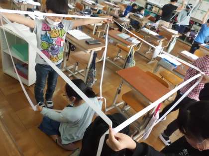 実際にテープで表してみると,全員が「1立方メートルって,意外と大きい!」「もっと小さいと思っていた!」と驚いた様子でした。