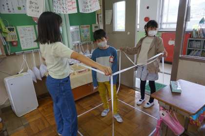 11日(水),1組でも,算数科「体積」の学習を行いました。実際に,テープを使って表してみることで,「1立方センチメートルとは,全然違うな。」と気づいたり,「部屋みたい。」と一人ずつ中に入ってみたりと,楽しんで活動していました。