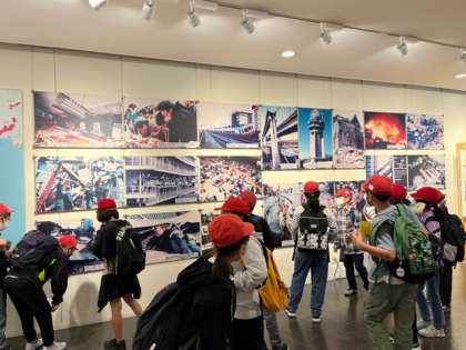 館内の見学です。写真を見たり,実際の断層を見たりしています。地震の恐ろしさ,自然の力の大きさを感じています。自分や家族の身の守り方についても考えながら見学をしています。