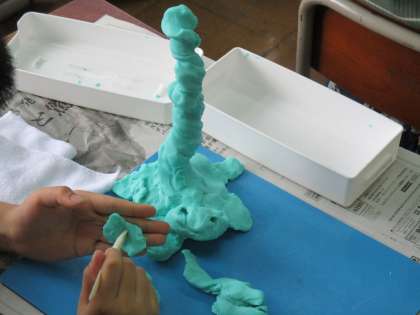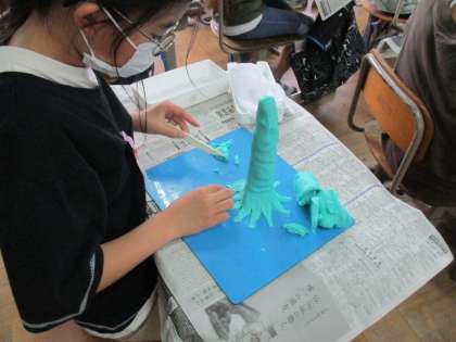 図工の学習で,油ねんどを使って立体の作品を作りました。ねん土を板の形にしたり,棒の形にしたり,丸い形にしたりして,それらを組み合わせて作品を立ち上がらせることをめあてに取り組みました。自由に発想しながら作ることができました。