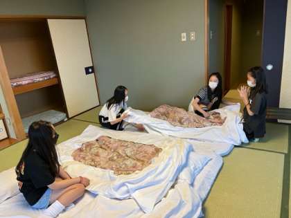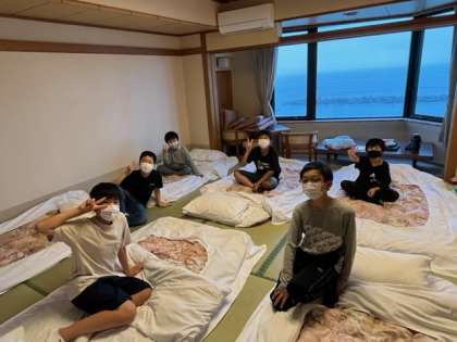 本日宿泊するホテルに到着しました。荷物整理をし,布団を敷いたり,休憩をしたりしています。この後は入浴の時間となります。