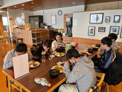 修学旅行でみんなで食べる最後の食事となりました。2日間の出来事を思い出しながら食べています。