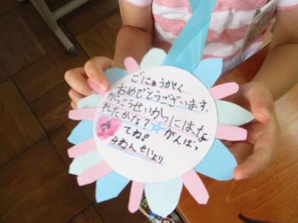 26日,朝の時間に4年生から1年生をむかえる会で作ってくれたメダルをもらいました。