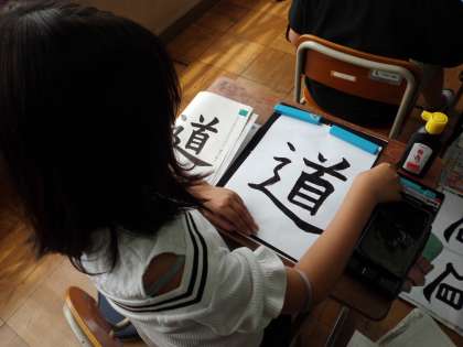 特に,しんにょうをバランスよく書くのが難しく,「曲がり」や「折れ」,「横はらい」など,お手本をじっくりと見ながら一画ずつ丁寧に書いていました。