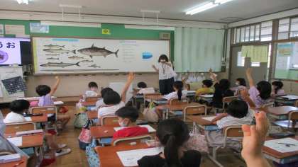 先週,栄養教諭の先生に,普段食べている給食の魚のことについて教えてもらいました。給食には,いろんな種類の魚が使われており,どれも栄養がしっかりとれる大事な食べ物であることを教えてもらいました。