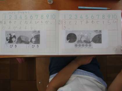 ゆっくり数図ブロックを置いて数を調べてノートに書き,あわせての動きもみんなで確認しながら学習しました。