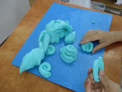 「ひもひもねんど」では,粘土をひも状にして,長くしたり,太くしたり…たくさん触って形の変化を楽しみました。ぐるぐる巻きにした子やひもを巻き付けた子もいました。それぞれ楽しい作品ができました。最後にはみんなで,美術展をしました。