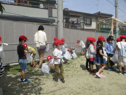 13日(月)全校でごみゼロの活動をしました。1年生は,運動場の西側の草を抜いたり,小石を拾ったりしました。