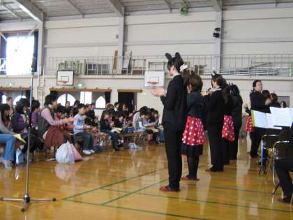 当日は、地域や保護者・児童の皆さんにたくさん参加していただき、楽しいコンサートになりました。プログラムの中に、リコーダーとカスタネットを使って、子ども達が楽団の方々といっしょに演奏する曲もあり、子ども達はいっしょうけんめい演奏していました。