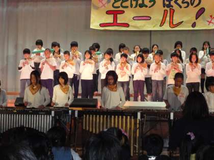 11月9日(水)の学芸会で,5年生は『とどけよう ぼくらのエール!』の気持ちを合奏や合唱の音楽・呼びかけのコールにのせて演じました。