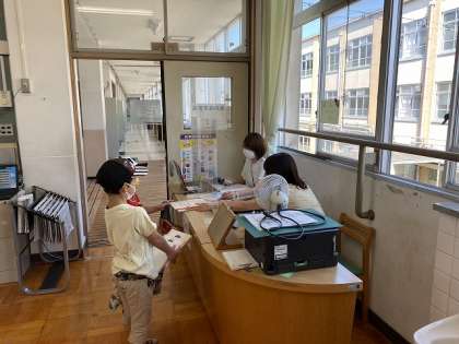 3日(水)、リニューアルした学校図書館の開館日。兄弟姉妹や友だちといっしょに、たくさんの人が本を借りに来てくれました。