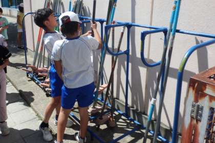 今日、校長先生が竹馬の整理をしていると、「手伝います!」と駆け付けてくれる高学年の子ども達が・・・。ぐちゃぐちゃになっていた竹馬を、素早く整頓してくれました。早速、子ども達の「やさしさいっぱい」の姿が見られました。手伝ってくれたみんな、ありがとう!きれいに整頓された竹馬で、たくさん体を使って遊んでほしいと思います。