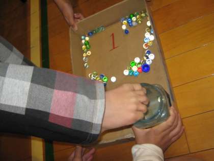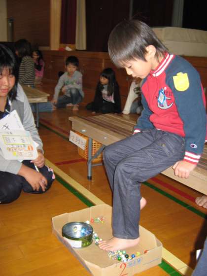 24日の中間休み、低学年のビー玉つかみ大会が体育館で行われました。