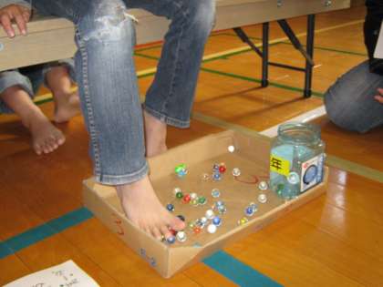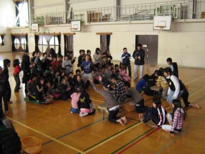 今日は朝からよく冷える寒い日でしたが、子どもたちは寒さに負けずはだしで元気に過ごしています。中間休みには、3・4年生のビー玉つかみ大会が行われました。