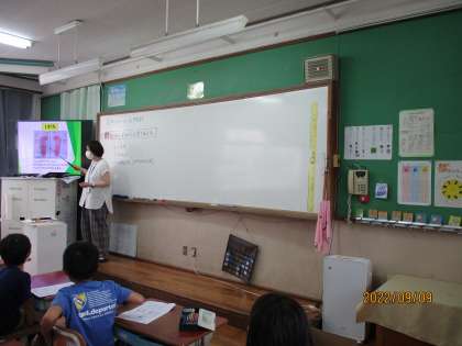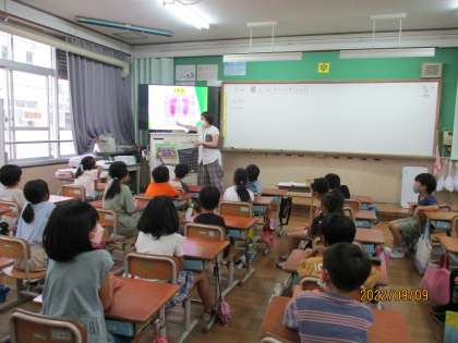 9日(金)この週はすこやか週間でした。そして、この日は1学期に測定した自分の足型を観察しました。見るポイントは「土踏まず」と「浮指」です。養護の先生からさまざまな足型の特徴を教えていただきました。